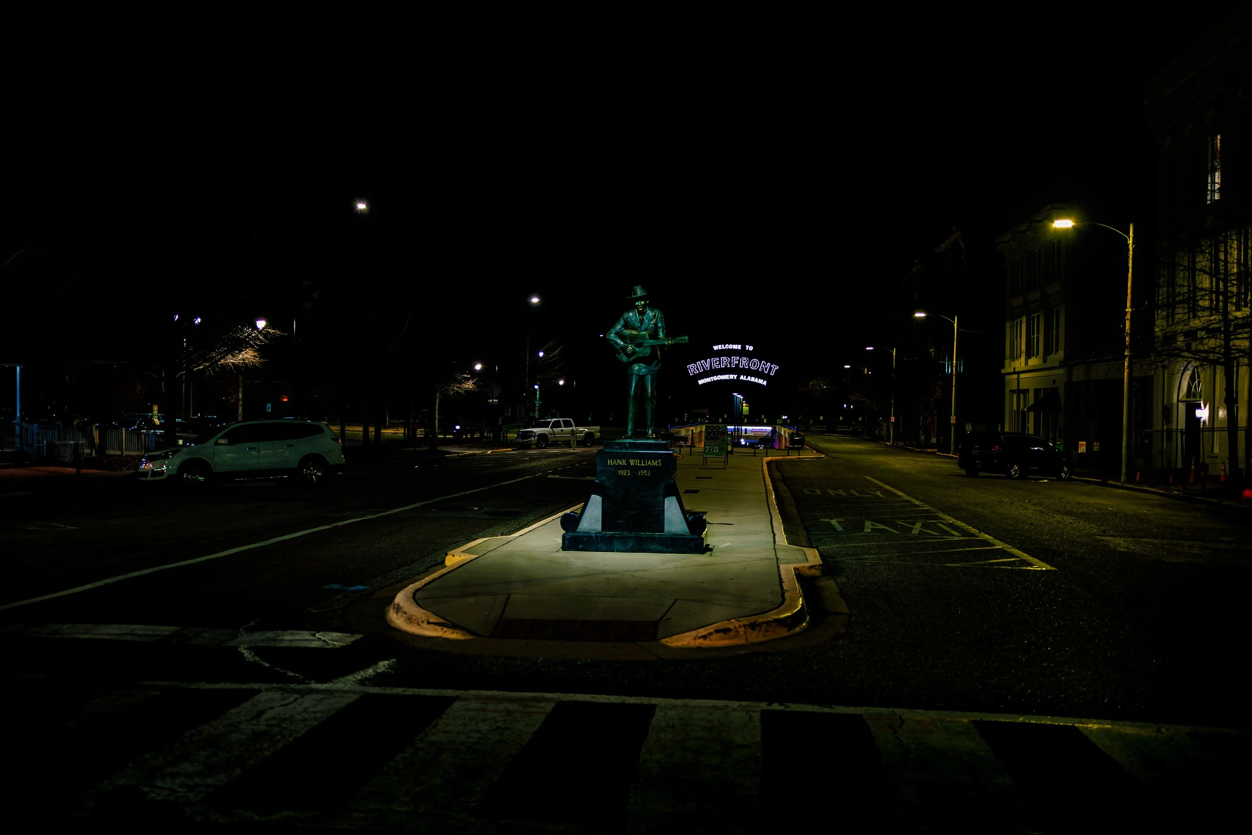 In the quite of an empty street, the statue stands illuminated, as if the music and memory of the place still linger in the night..
